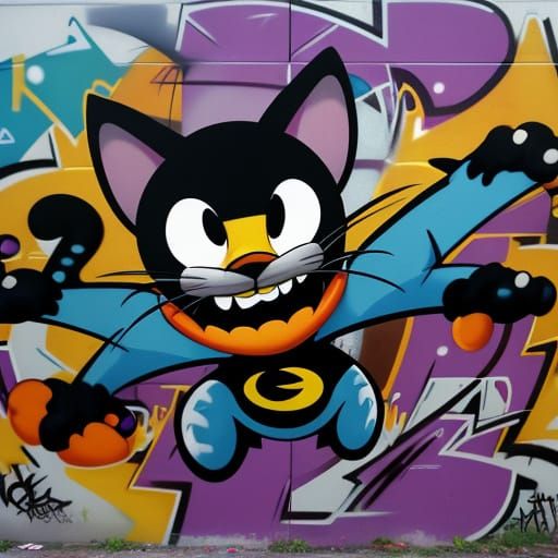 This image shows a cat with a jetpack flying through the air. The digital artwork features a cartoonish, graffiti-inspired aesthetic with exaggerated features.