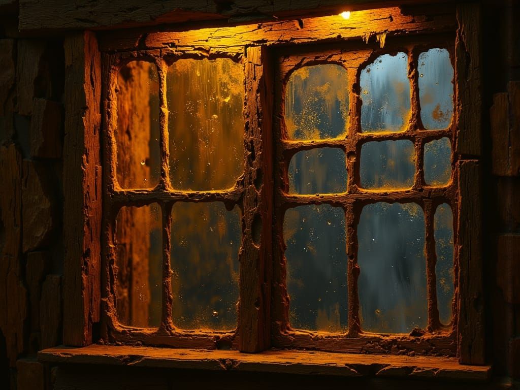 This image showcases a rustic tavern window glowing warmly against a rain-soaked night. Soft amber light creates a cozy atmosphere, highlighting detailed textures and condensation.