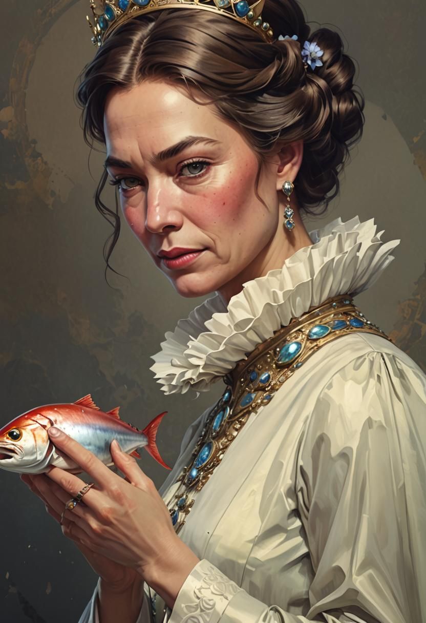 This image shows Queen Elizabeth II wearing a tuna fish sandwich as a crown. The portrait features dynamic lighting, intricate detail, and vibrant colors as digital art.