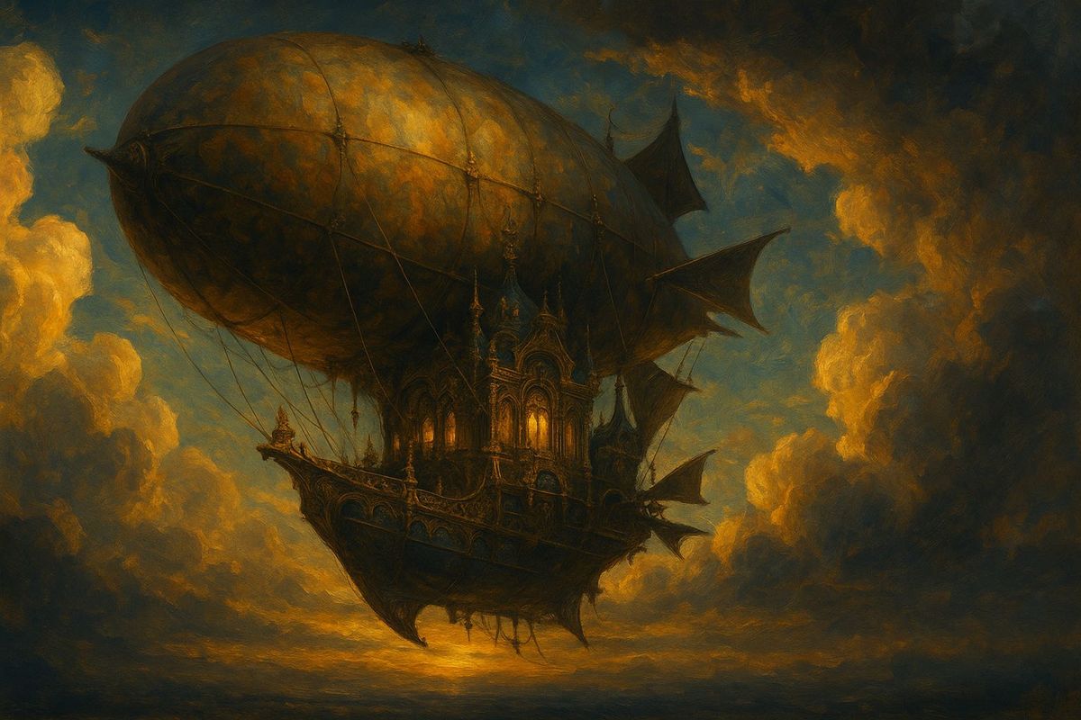 A striking picture of a richly decorated airship sailing through clouds at sunset. The image is an oil painting rendered with intricate details, dramatic lighting and complementary colours.