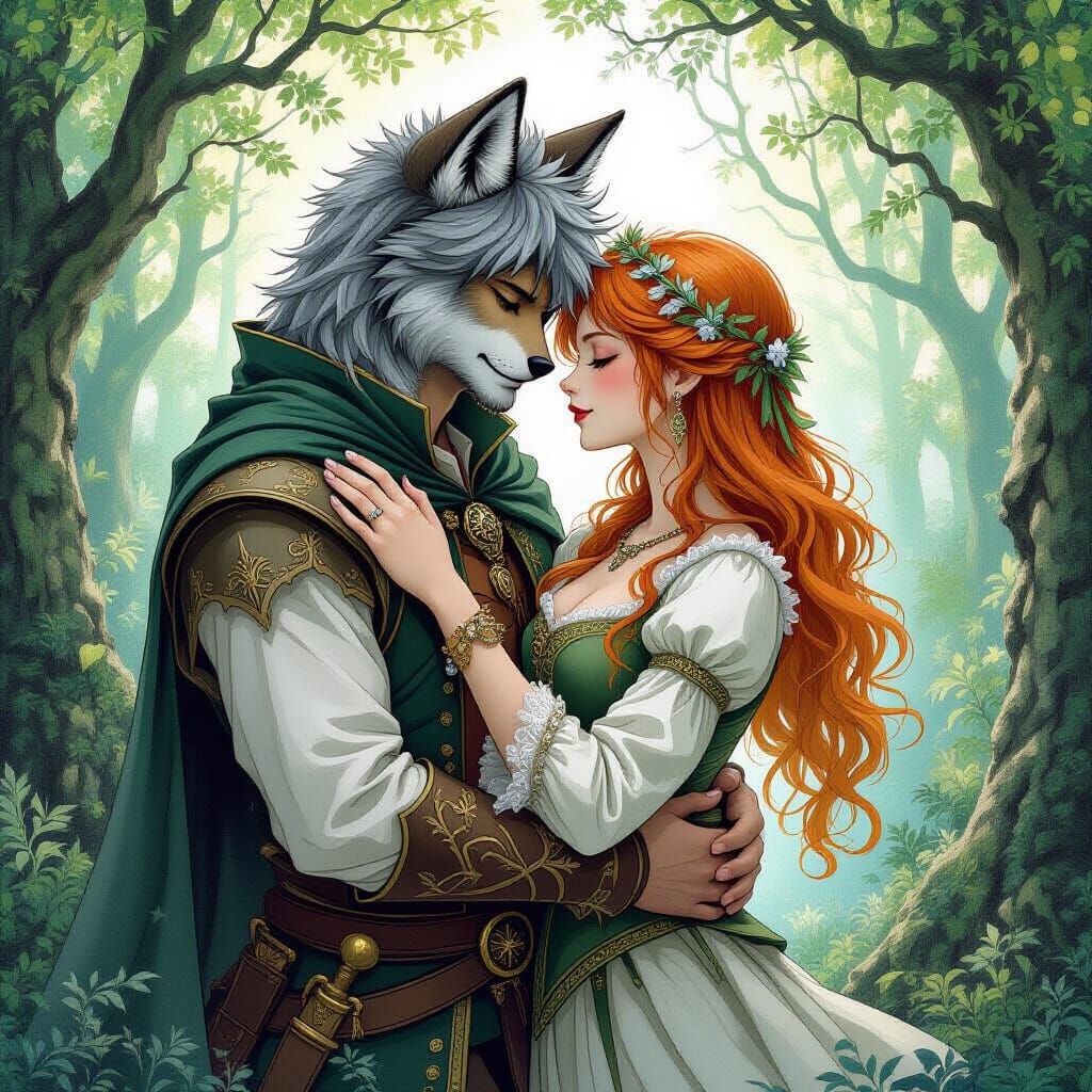 A vivid image of a wolf boy and wolf girl embracing in a forest setting. The artwork evokes dreamlike illustrations with intricate details and inspiration from fantasy art.