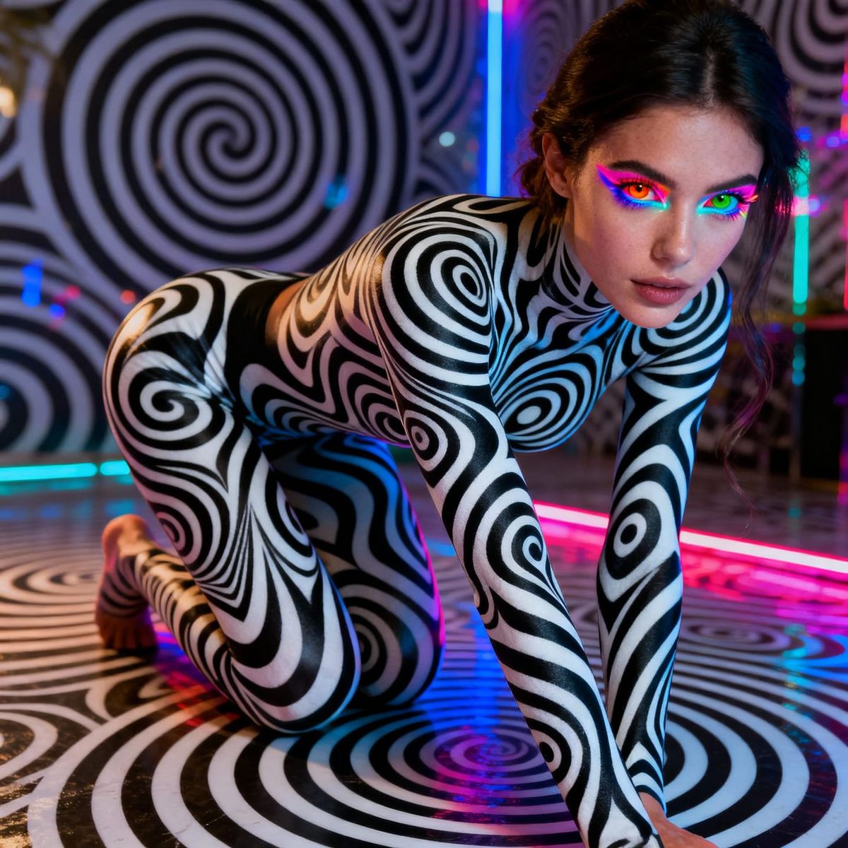 A stunningly detailed photograph of a woman with vibrant, neon-colored eyes and intricate optical illusion patterns on her skin, captured with a wide-angle lens.