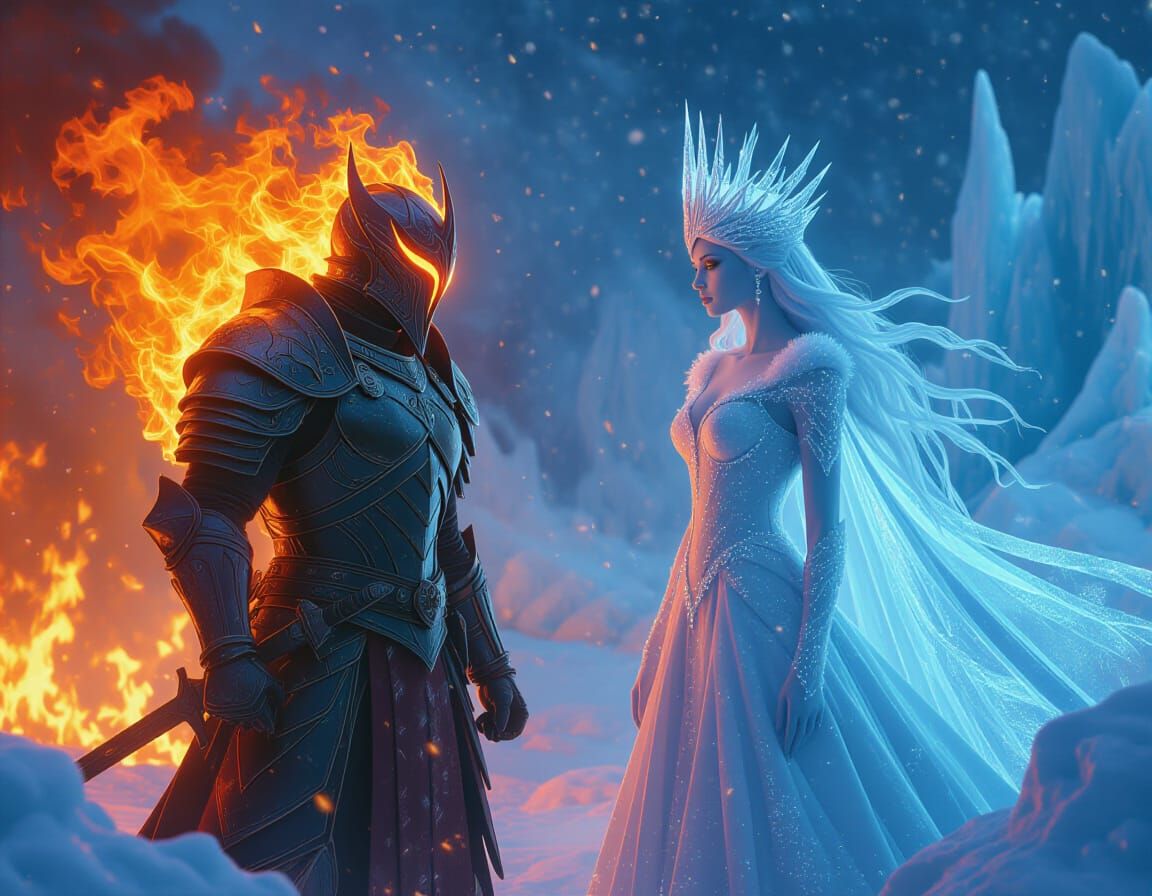 This image depicts a blazing warrior of fire confronting an icy queen of crystal frost. Their powers clash in a dramatic, surreal scene.
