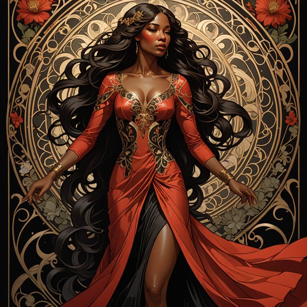 A full-body illustration of a beautiful black woman with long hair in a flowing red dress, depicted in an elegant Art Nouveau style with intricate patterns and dramatic lighting.