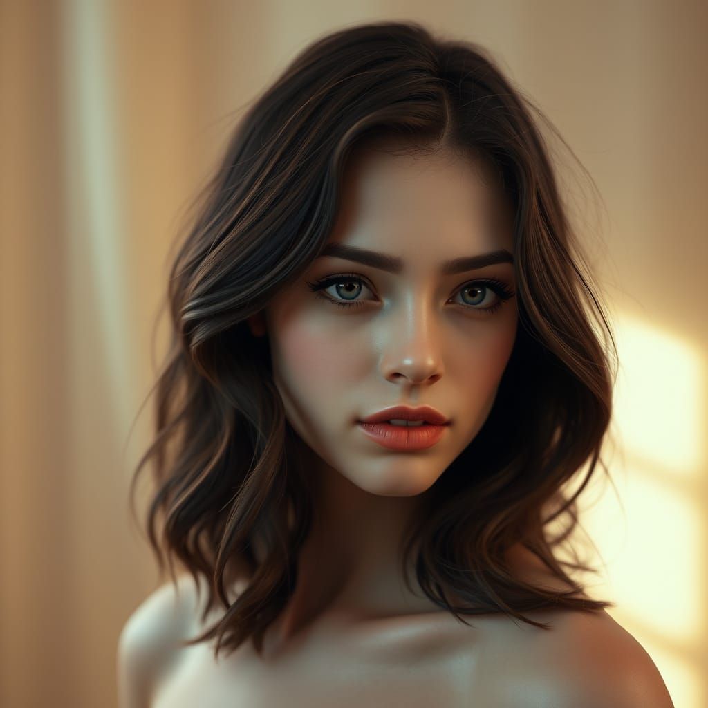 This image captures a young woman with wavy, dark hair and light skin, exuding a thoughtful expression. Her delicate coral-pink lips add warmth to her demeanor, while the soft focus and warm color palette create a cozy atmosphere, inviting intimacy and contemplation.