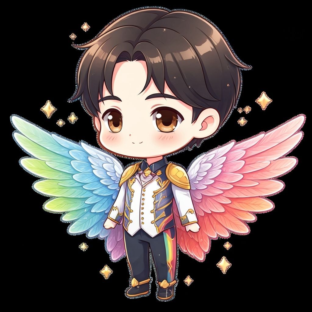 A washi tape art image of a chibi man with black hair and brown eyes. He is wearing a rainbow suit and wings in this super cute digital artwork.