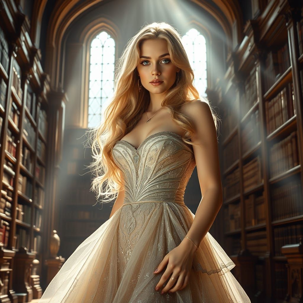 This image shows a beautiful woman with long blond hair and emerald eyes in a grand library. Sunlight illuminates the scene, reminiscent of Baroque painting with photorealistic details.