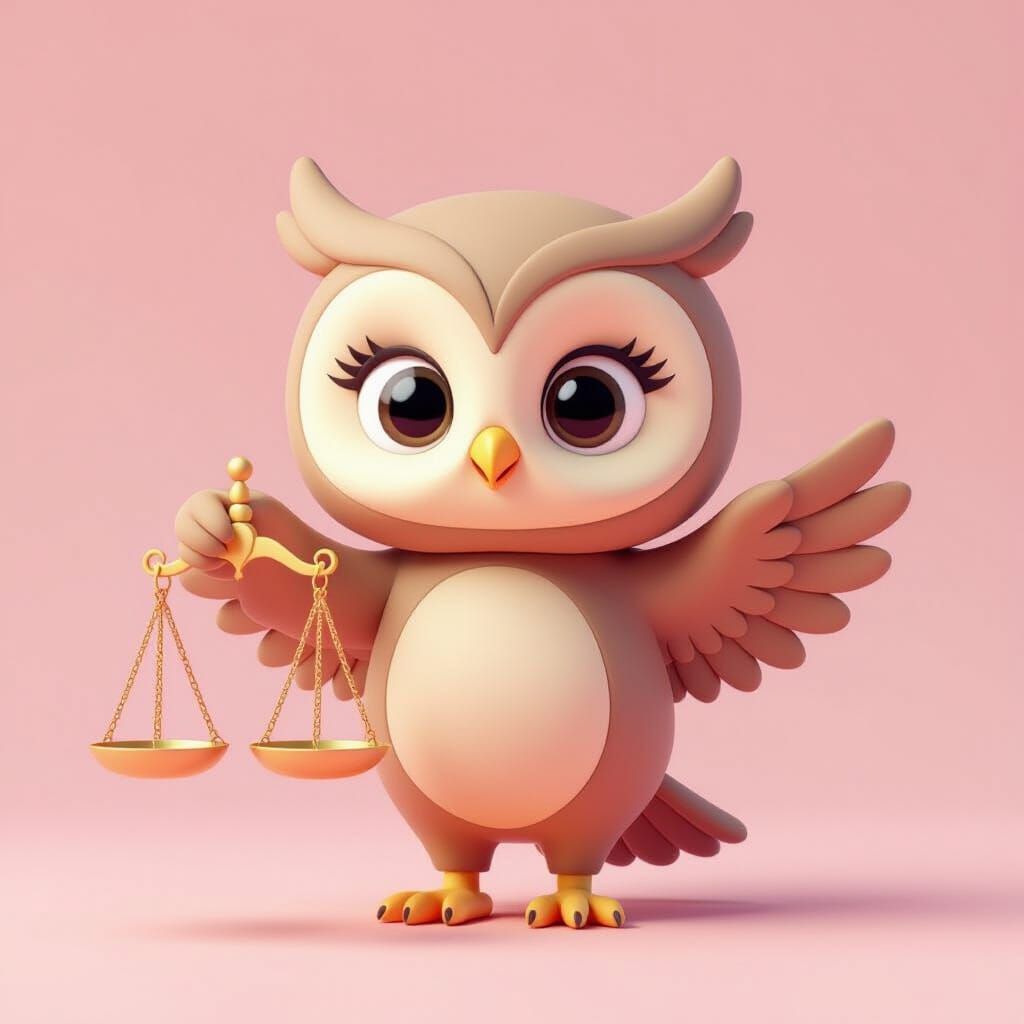 This image shows a cute, wise baby owl character representing Libra, holding balanced scales. Rendered in a minimalist 3D style with soft lighting and pastel colors.