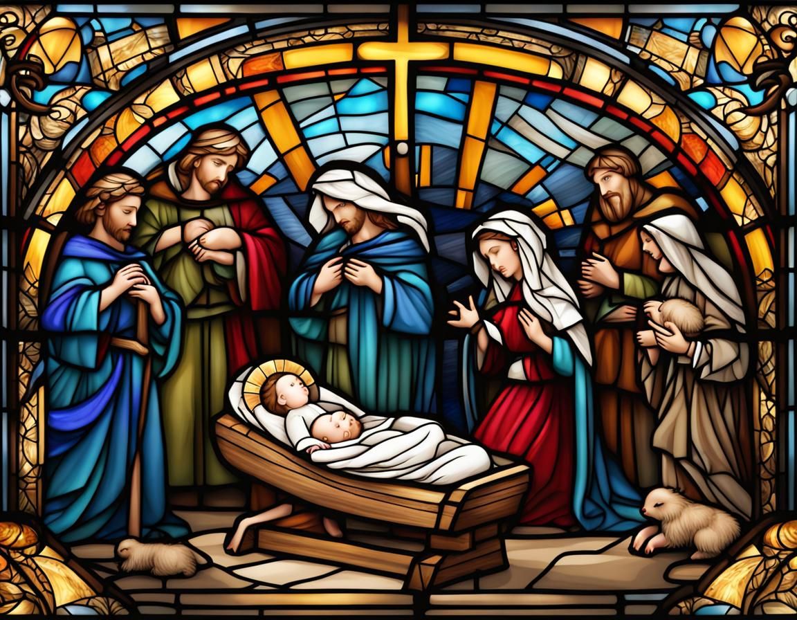 A beautiful stained glass image of the nativity. The iconic scene is rendered in vibrant colors, mimicking the aesthetic of traditional stained glass art.