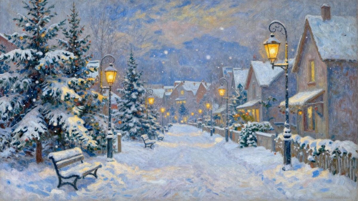 This image depicts a tranquil winter Christmas village in an impressionistic style. Visible brushstrokes and atmospheric focus highlight a snowy path, snow-laden trees, and warm lamplight creating a harmonious and cheerful holiday scene.