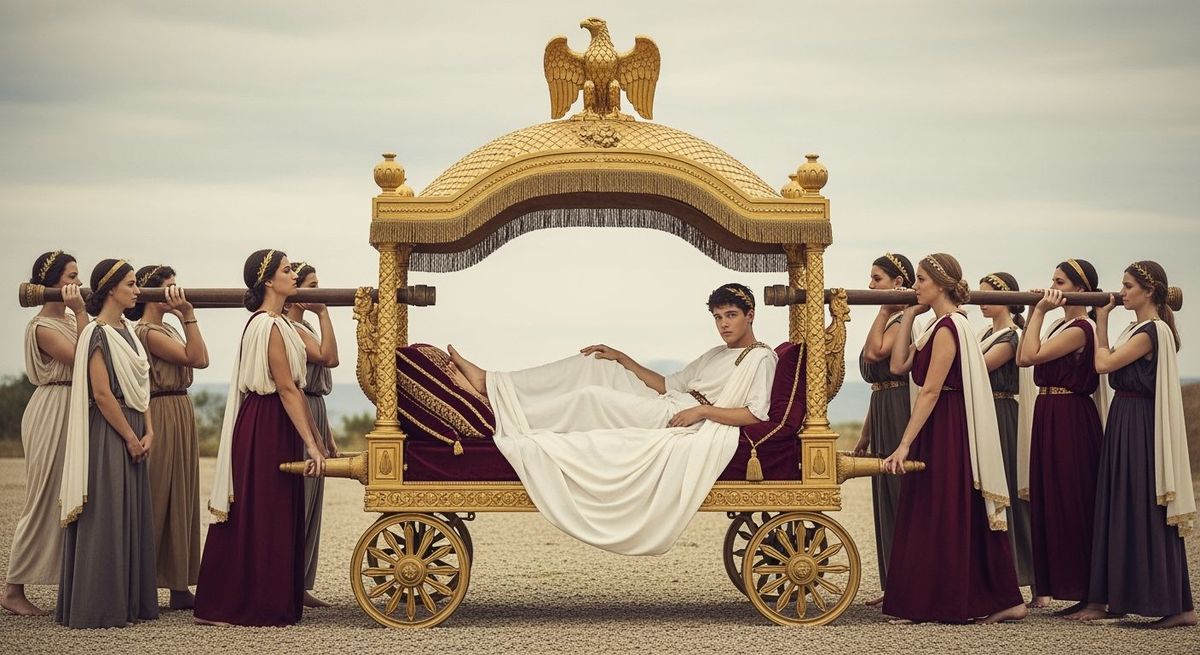 This image shows a Roman Emperor relaxing on a gold litter, carried by servants. The scene is captured with sharp focus, bokeh, and soft natural lighting, reminiscent of high-end professional photography.