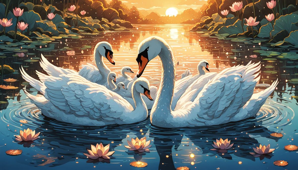 A majestic swan mother glides across a serene lake, her cygnets perched on her back, surrounded by vibrant lotus flowers and twinkling fairy lights, all bathed in warm golden hour light.
