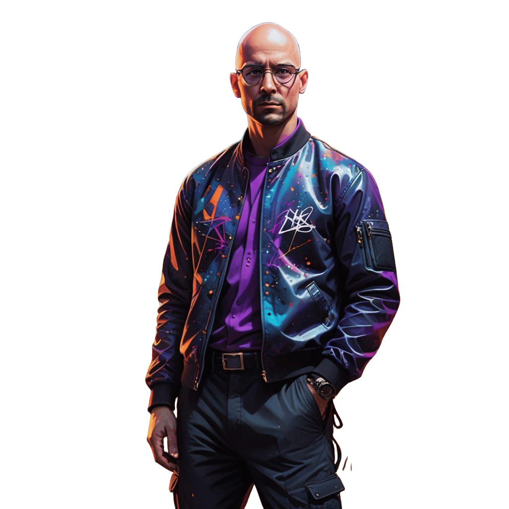 A dynamic portrait of a bald man in a colorful graffiti art style, featuring splatters of ultraviolet paint and vibrant abstract gradients.
