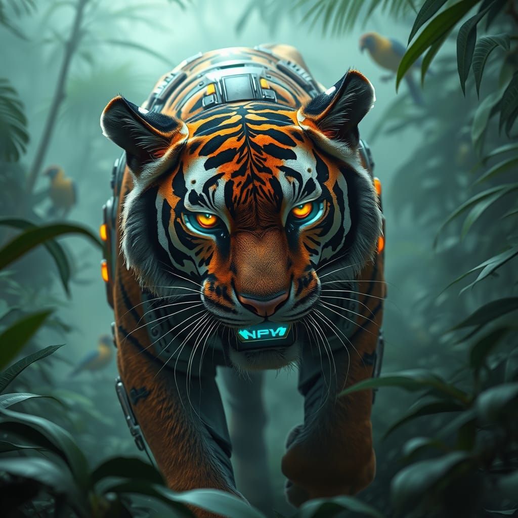 This image depicts a futuristic cyborg tiger navigating a dense jungle environment, characterized by its vibrant neon stripes, metallic fur, and advanced mechanical eyes. The scene is set amidst lush foliage, misty air, and exotic bird sounds, blending elements of Syd Mead's sleek futurism and Ash Thorp'...
