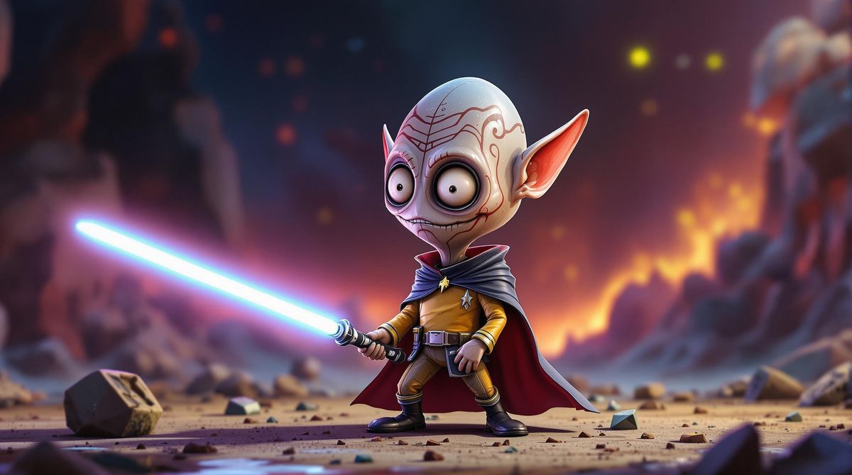 This vibrant, Tim Burton-inspired illustration features a fantastical, star-wearing cutlery duo in a Star Trek and Star Wars mashup. Polished, intricate details abound in this surreal, hyper-realistic masterpiece.