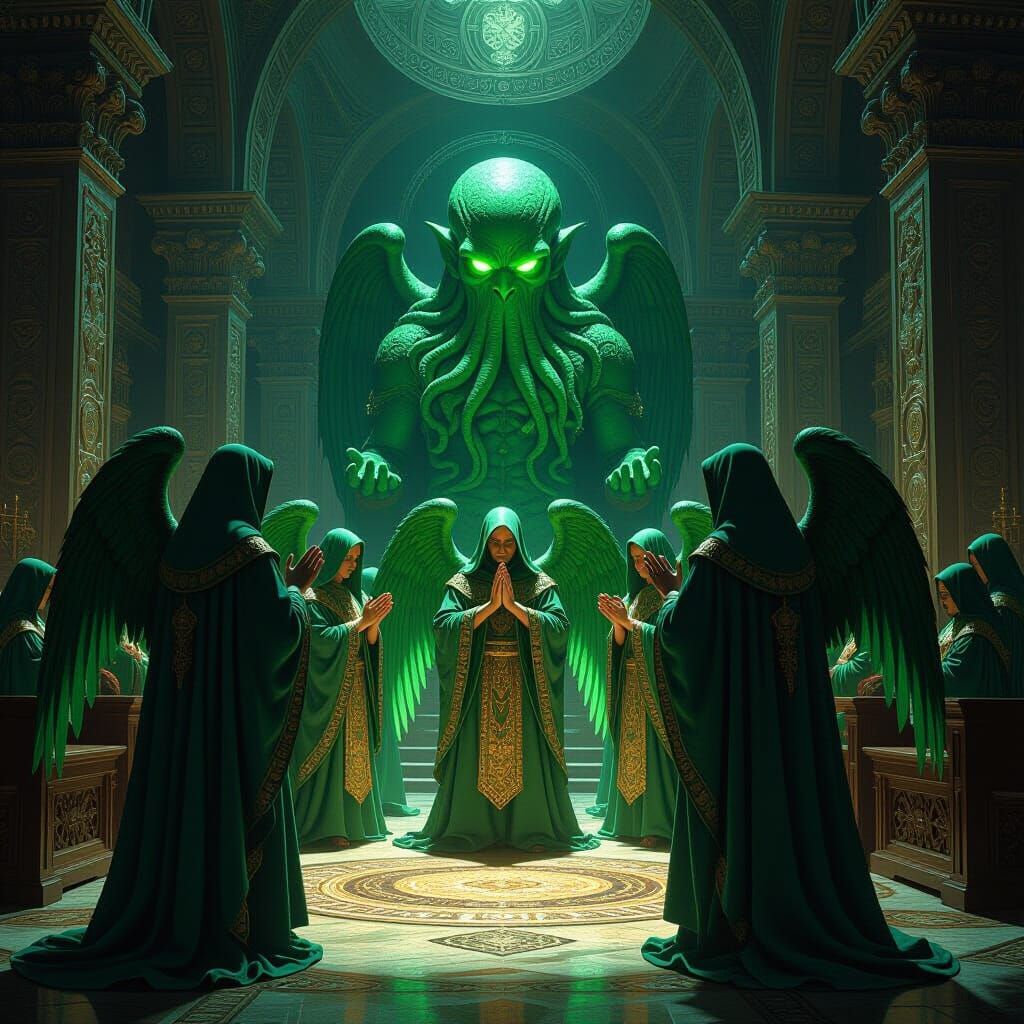This image shows luminous green, angelic figures in robes being worshipped by priests inside a grand temple. The scene is depicted with dramatic chiaroscuro lighting and in vivid atmospheric style.