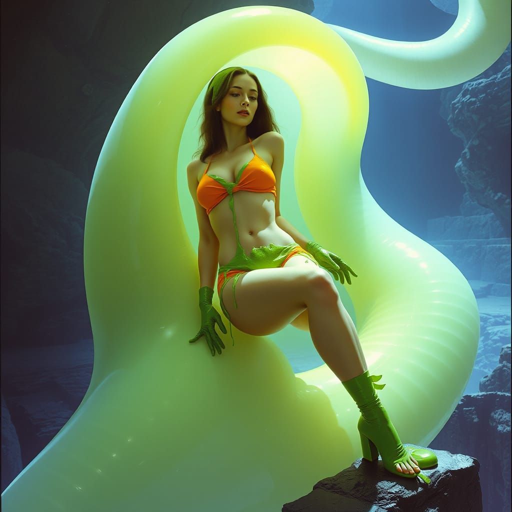 A surreal image of a woman in an orange bikini covered in green goo being engulfed by a slimy slug. The artwork features biomechanical and futuristic elements with a dreamlike atmosphere.