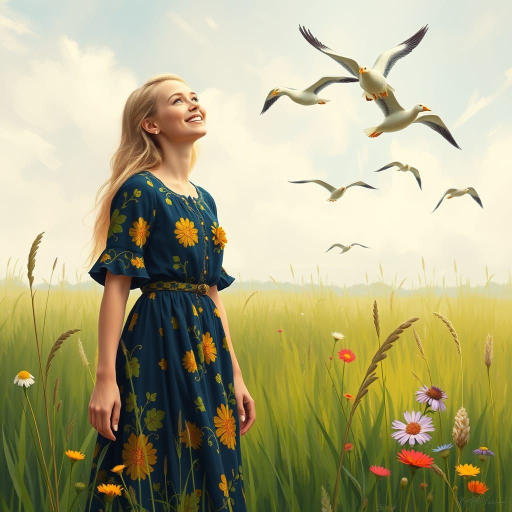 This image shows a serene European woman in a beautiful dark blue dress with yellow and orange flowers, surrounded by wildflowers and tall grasses, looking up in wonder as geese soar through the sky, captured in a soft, impressionist style with delicate brushstrokes and soft lighting.