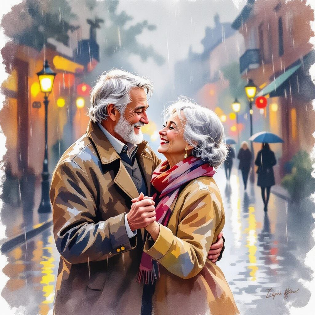 A romantic watercolor painting shows an elderly couple dancing joyfully in soft rain on a cobblestone street. Diffused golden hour light creates a warm, ethereal glow.
