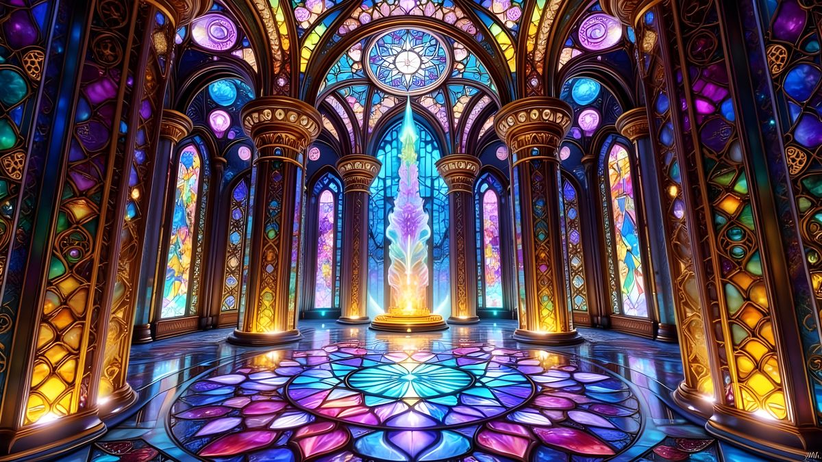 A breathtaking image of a stained glass cathedral with divine light filtering through fractal patterns. The artwork features shimmering iridescence, kaleidoscopic mosaics, and vibrant colors.