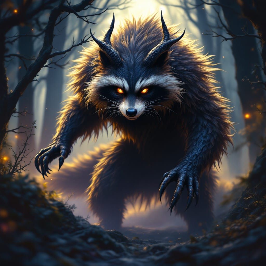 This image shows a raccoon dragon hybrid with a fluffy coat, dragon horns, wings, and claws, set amidst eerie woods with an otherworldly energy. A blend of darkness and golden lighting creates a mystical atmosphere with rich, dreamlike colors.