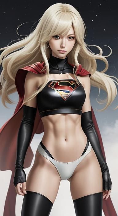 This image depicts a slender Supergirl with defined abdominal muscles, wearing black boots, a cropped bra, and low-waist white leggings. The artwork is in an anime style.