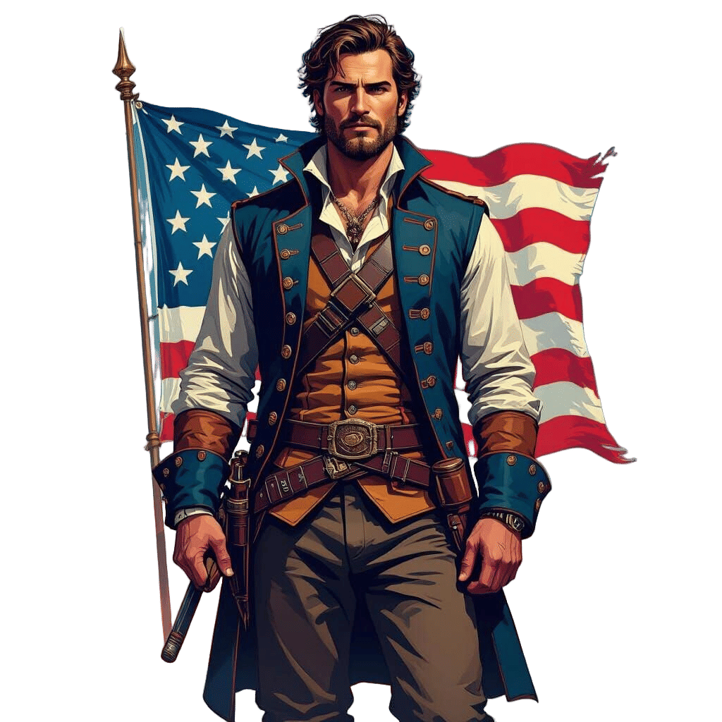 This image depicts an American patriot in detailed attire, standing proudly against a clear background. The artwork features a screen print style with bold outlines and a vibrant, colorful palette, reminiscent of realist concept art.