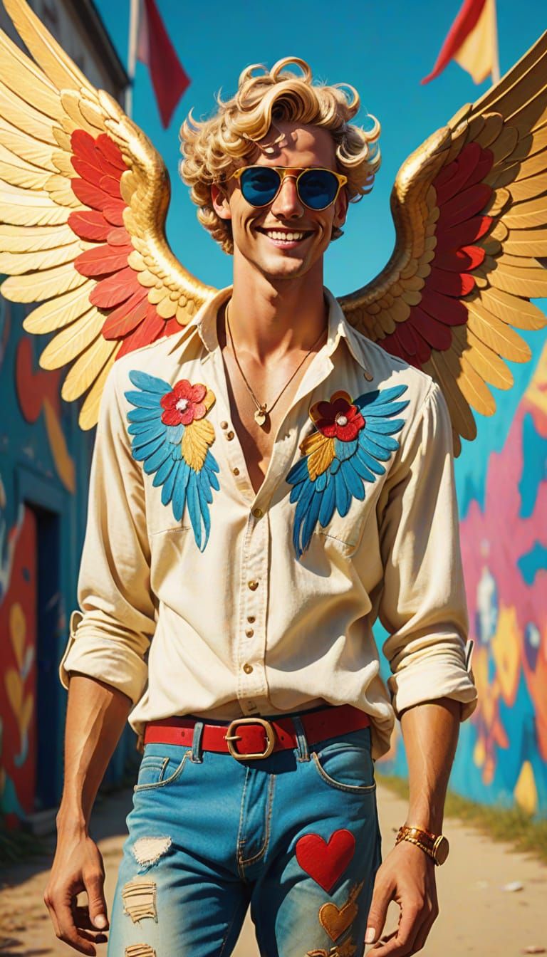 This image captures a vibrant, vintage-inspired depiction of Greek god Eros at the iconic Woodstock music festival. With a warm, golden glow and dynamic lighting, the scene is set against a colorful background of graffiti art and street murals, featuring a handsome Eros with blue eyes, golden curls, and ...