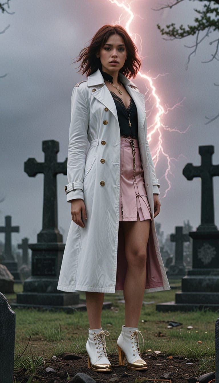 This cinematic image captures a powerful dark mage woman summoning golden and white lightning bolts, standing on a magical symbol in a misty graveyard, surrounded by the glow of golden hour lighting and intricate textures.