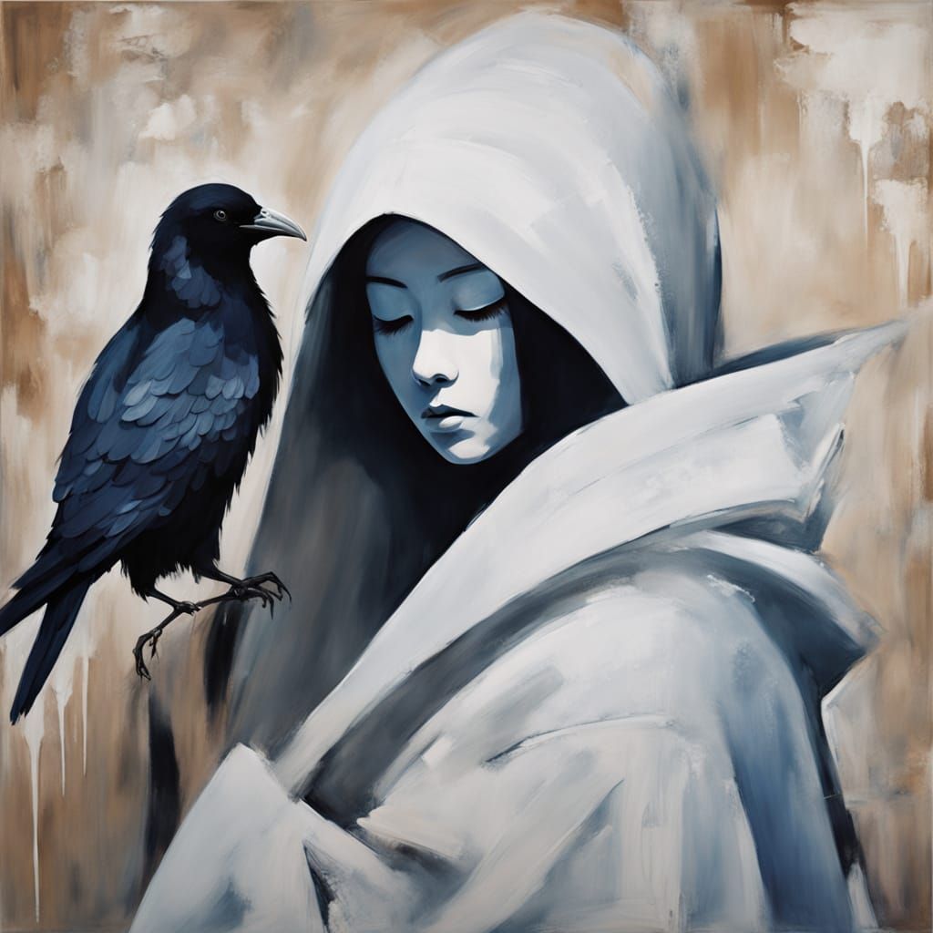 This image depicts a minimalist, expressionist oil painting of a white geisha silhouette in a hoodie and mask, holding an urn with a raven. Features vintage textures and blue/white colors.