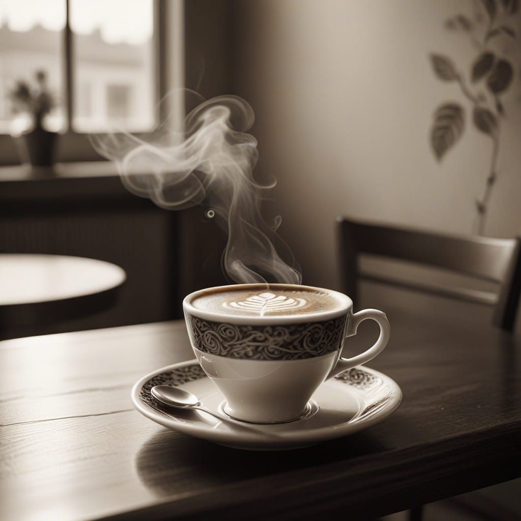 This image shows a beautifully crafted still life with intricate latte art on a classic table, shot in warm sepia tones with soft, moody lighting, evoking a sense of classic sophistication.