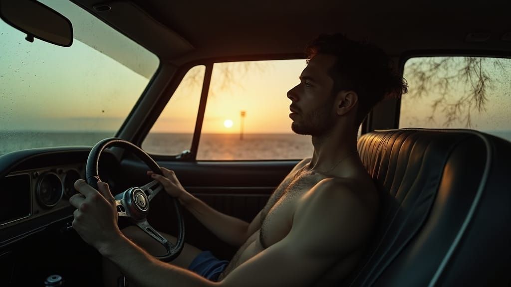 A dramatic image of a muscular man, shirtless, in a truck under intense heat. He's gripping the wheel with a weary, intense expression, rendered with cinematic lighting and a dark color palette.