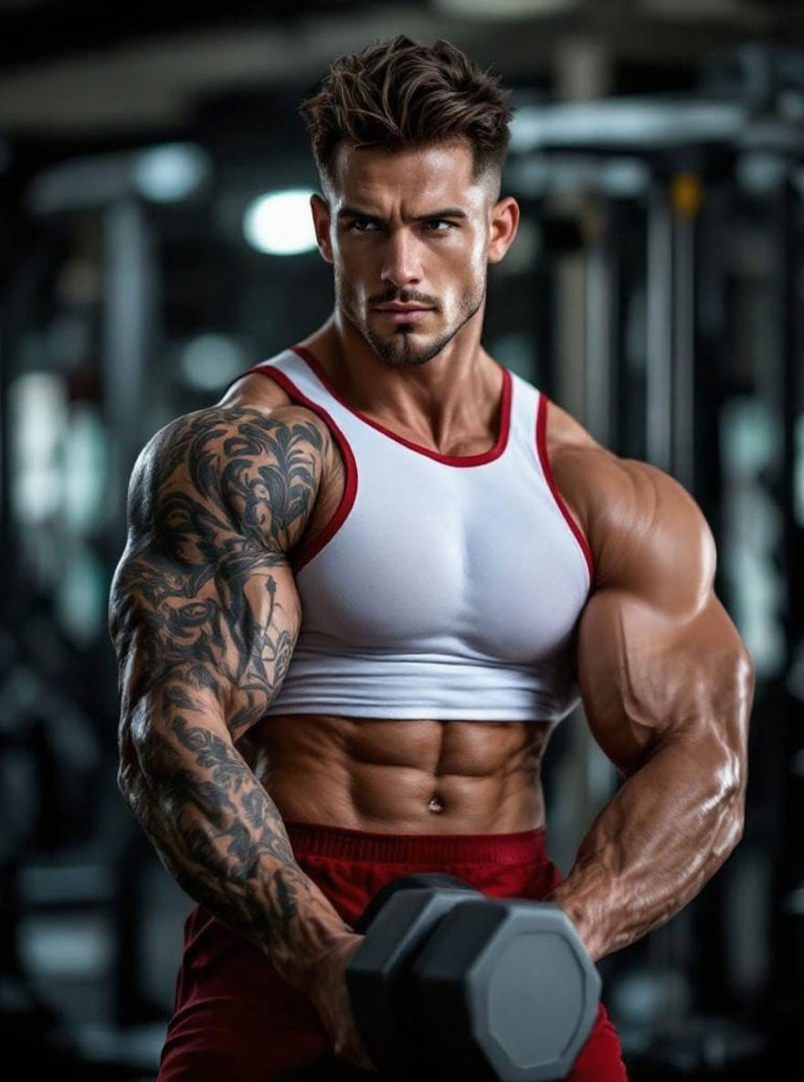 A hypermuscular man flexes his biceps in a gym. He is shirtless with tattoos and wearing a tight white and red lycra outfit. The image captures his intense workout.
