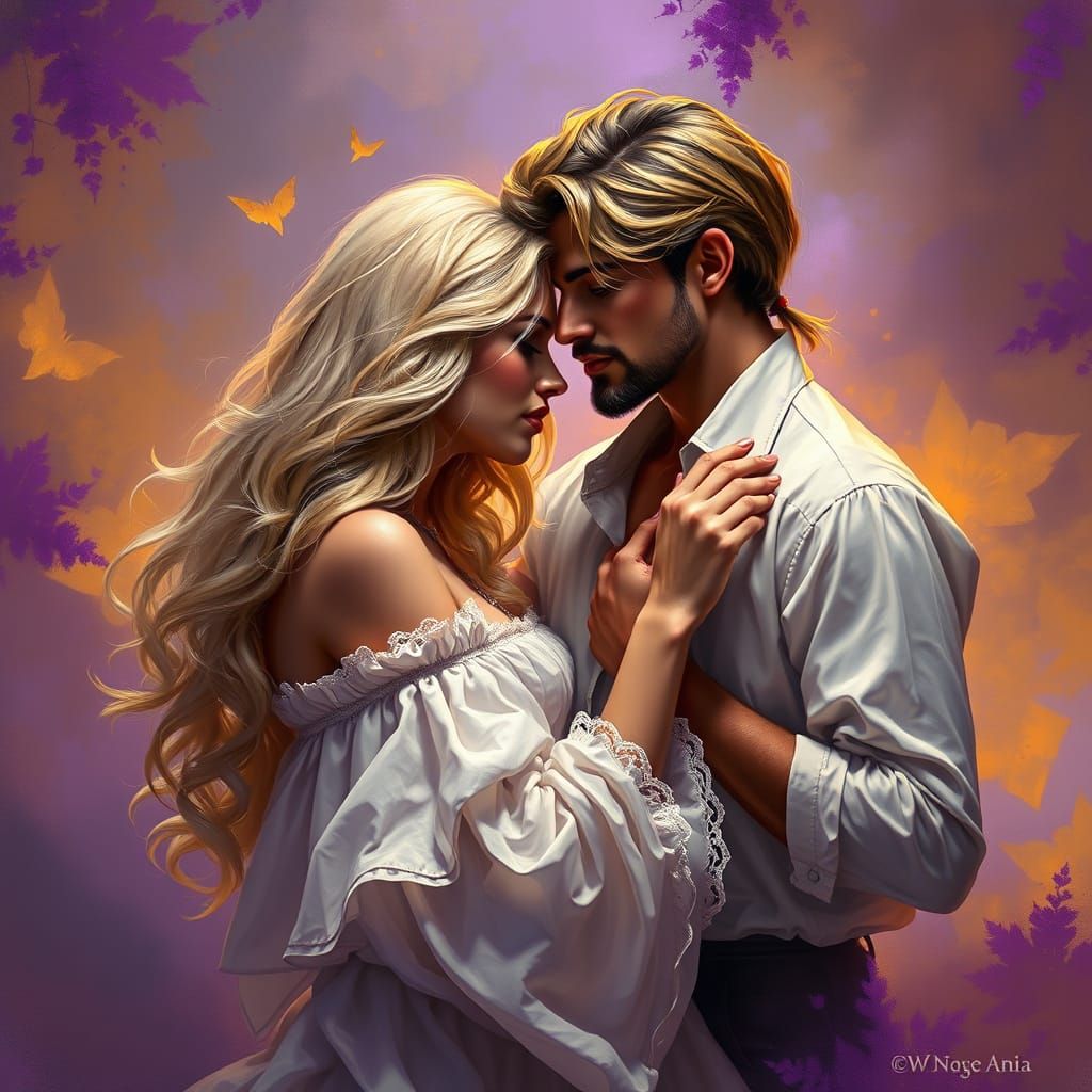 Nestled close, a blonde/brunette couple leans into each other,her white dress flowing in the ocean breeze, his fingers tracing gentle circles on her hand. Their laughter mingles with the soothing symphony of the sea, eyes locked, lost in a love as endless as the horizon. vibrant airbrush oil painting ...