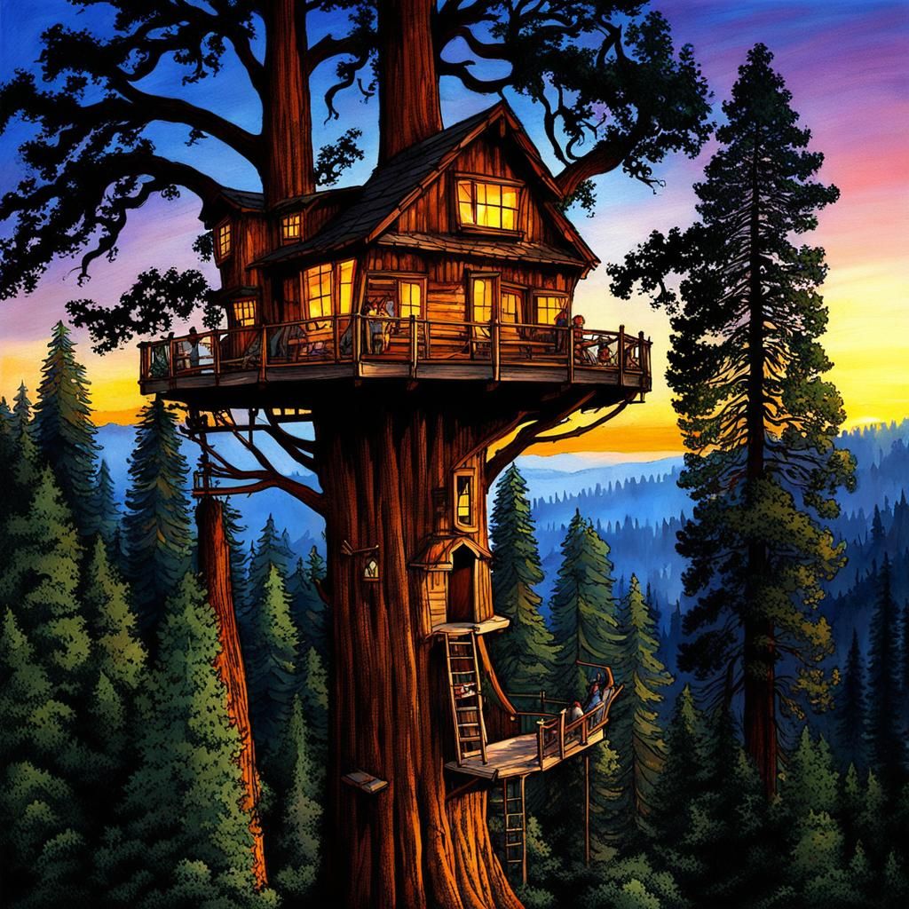 A vibrant image showing a treehouse perched high in a giant sequoia during sunrise. The scene evokes a whimsical, painterly style with an emphasis on natural light and color.