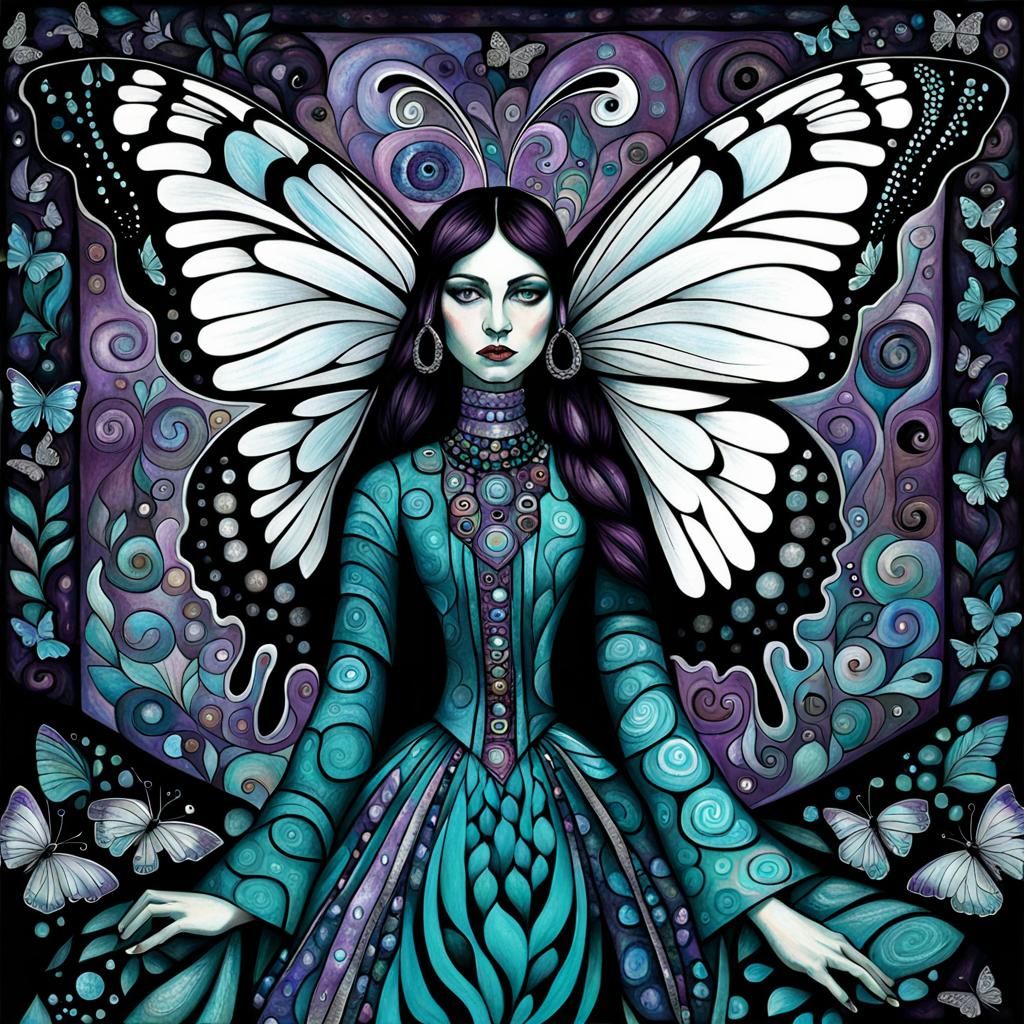 A digital painting of a girl composed of butterflies in shades of purple, silver and teal. The image has a kaleidoscopic effect in an art nouveau style.