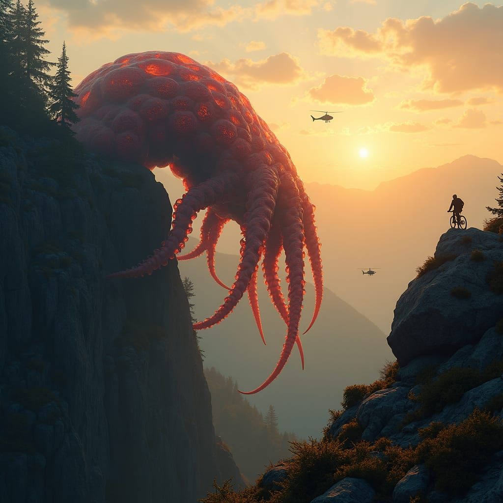 This image shows a colossal, octopus-like alien scaling the cliffs of Furka Pass at golden hour. Helicopters hover near the translucent creature with glowing internal organs, as a cyclist hides. Rendered with warm hues and HDR contrast.
