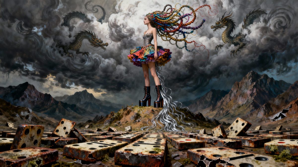 A surreal, dystopian mountain wasteland made of broken dominoes. A mythical heroine with elaborate hair stands centrally, her form merging with the landscape under ominous skies. Metaphysical painting style with dramatic lighting.