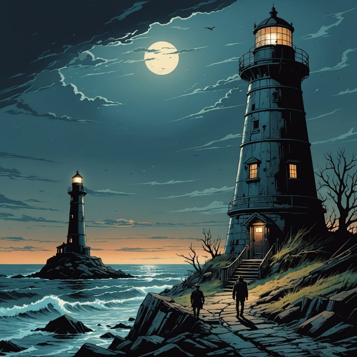 This image shows a spooky, abandoned lighthouse keeper in a horror style. The image is reminiscent of comic book art, with smooth lines and perfect composition.