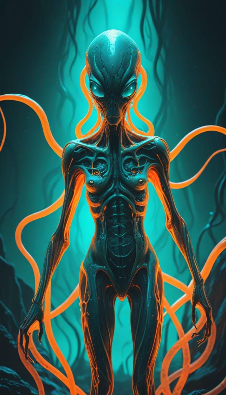 A striking picture of an alien in a dark, surreal landscape. The digital painting features glowing tentacles, swirling patterns, and a warm backlight in vibrant orange and teal.