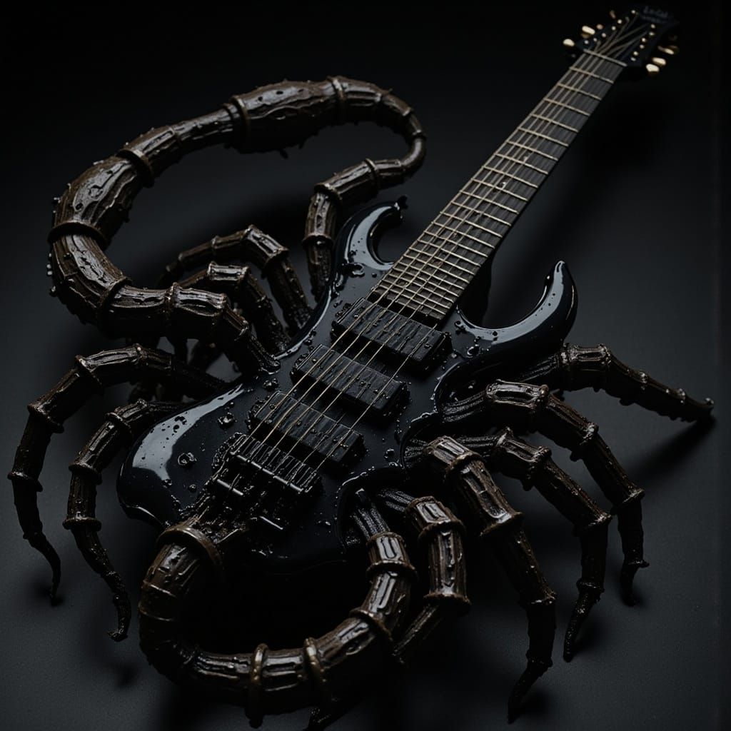 This image shows a guitar shaped like a scorpion with detailed curves and a glossy surface. This digital artwork has a soft focus effect and a futuristic design aesthetic.