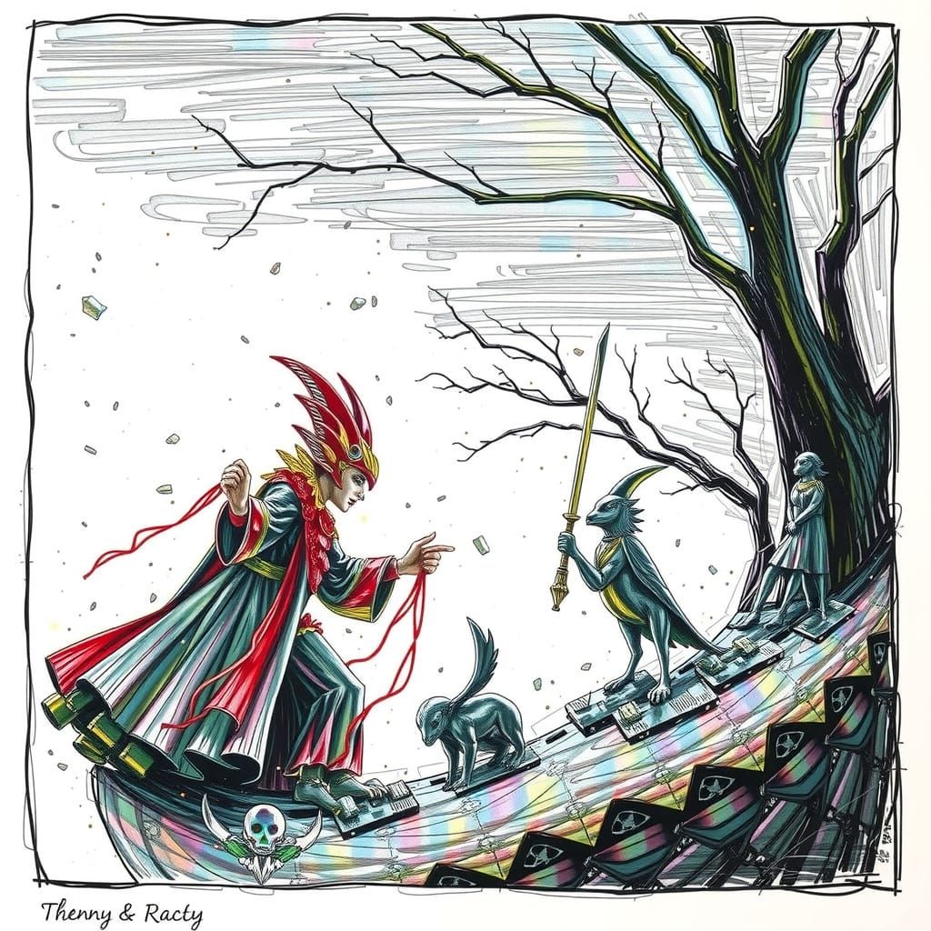 This image showcases a hyperrealistic sculpture bathed in vivid red, green, yellow, black, and white light. Intense, dynamic illumination highlights intricate textures for a striking visual.