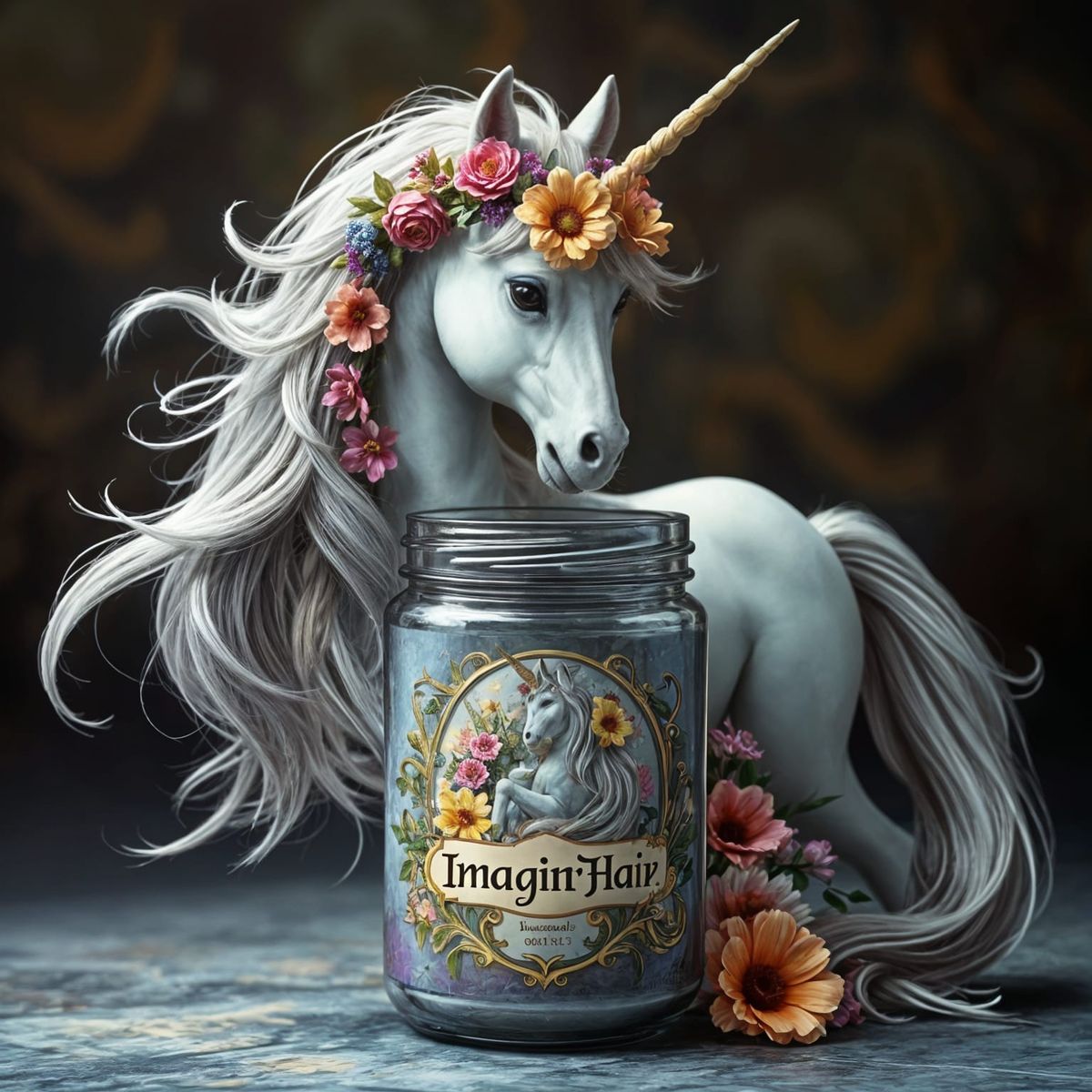 A gorgeous unicorn in front of a jar of "Imagin'Hair" promises to give the user "Beautiful Hair". The label features a breathtaking and cute hairy unicorn