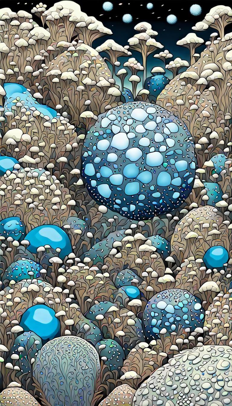 A vibrant digital illustration featuring an invisible sphere teeming with electric blue, bioluminescent organisms. The composition emphasizes depth and texture using 3D rendering techniques in a maximalist style.