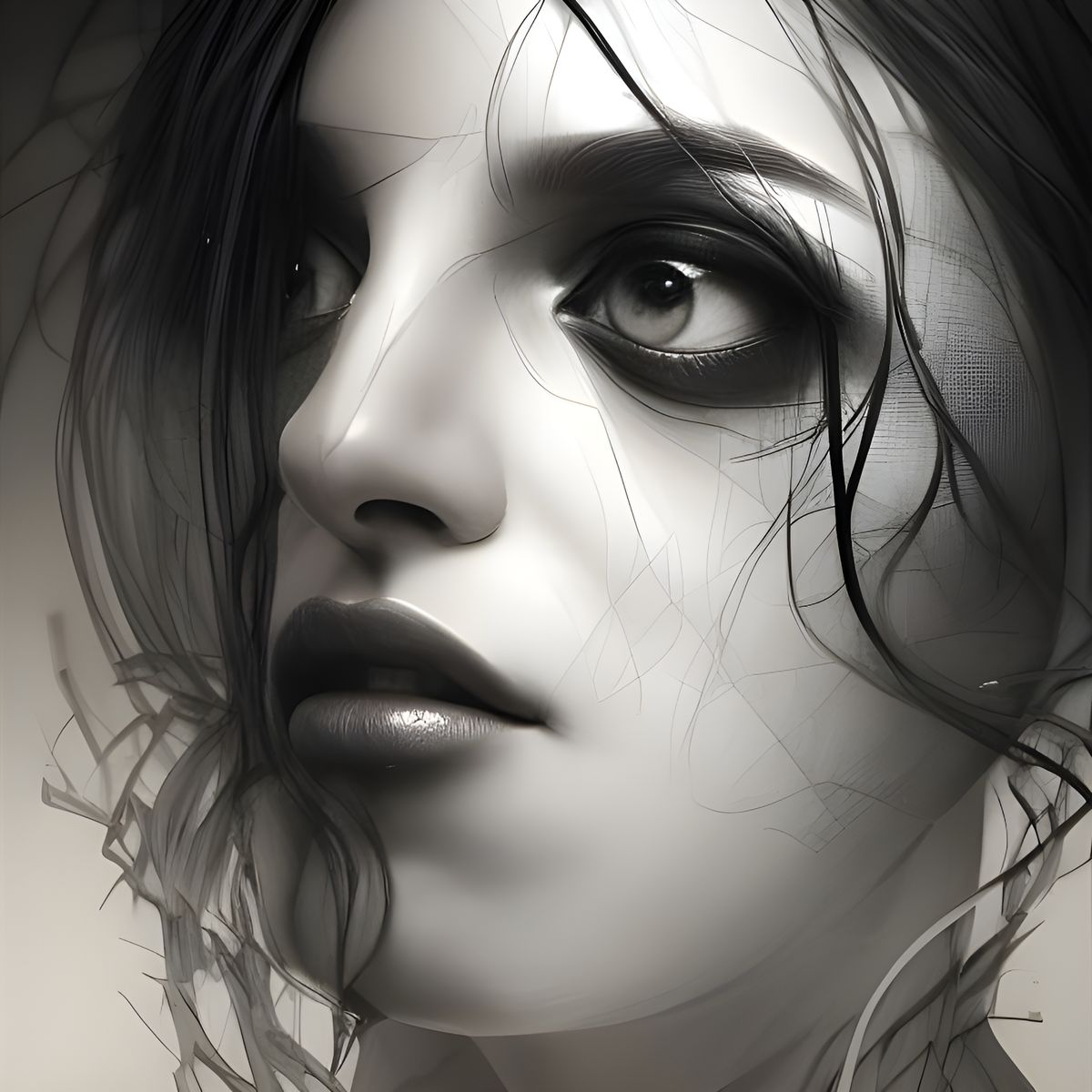 A detailed black pencil drawing of a head and shoulders portrait. The 8k resolution concept art features dynamic lighting and intricate details with saturated black color and triadic colors.