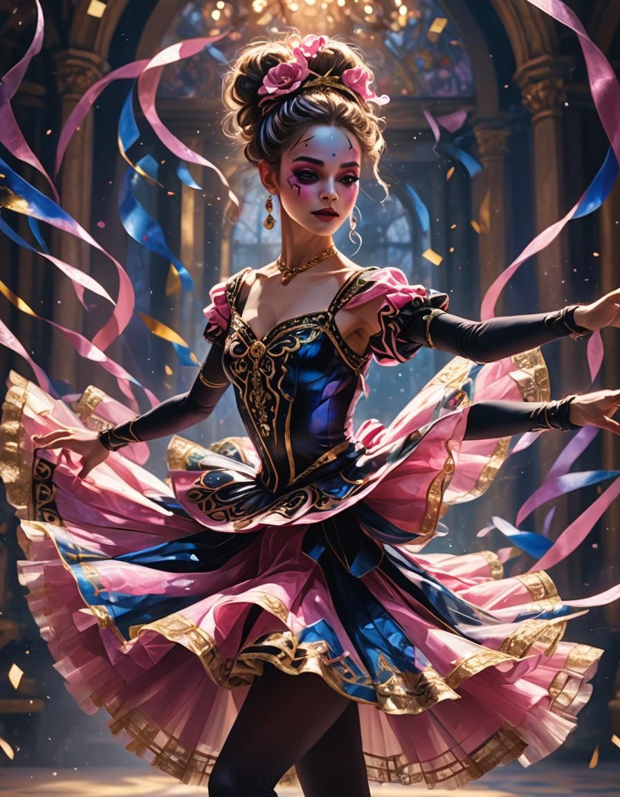 This image shows a harlequin ballerina in a dynamic pose. The artwork features a baroque fantasy style with vibrant colors, glittering details, and soft, golden lighting enhanced by deep blue shadows.
