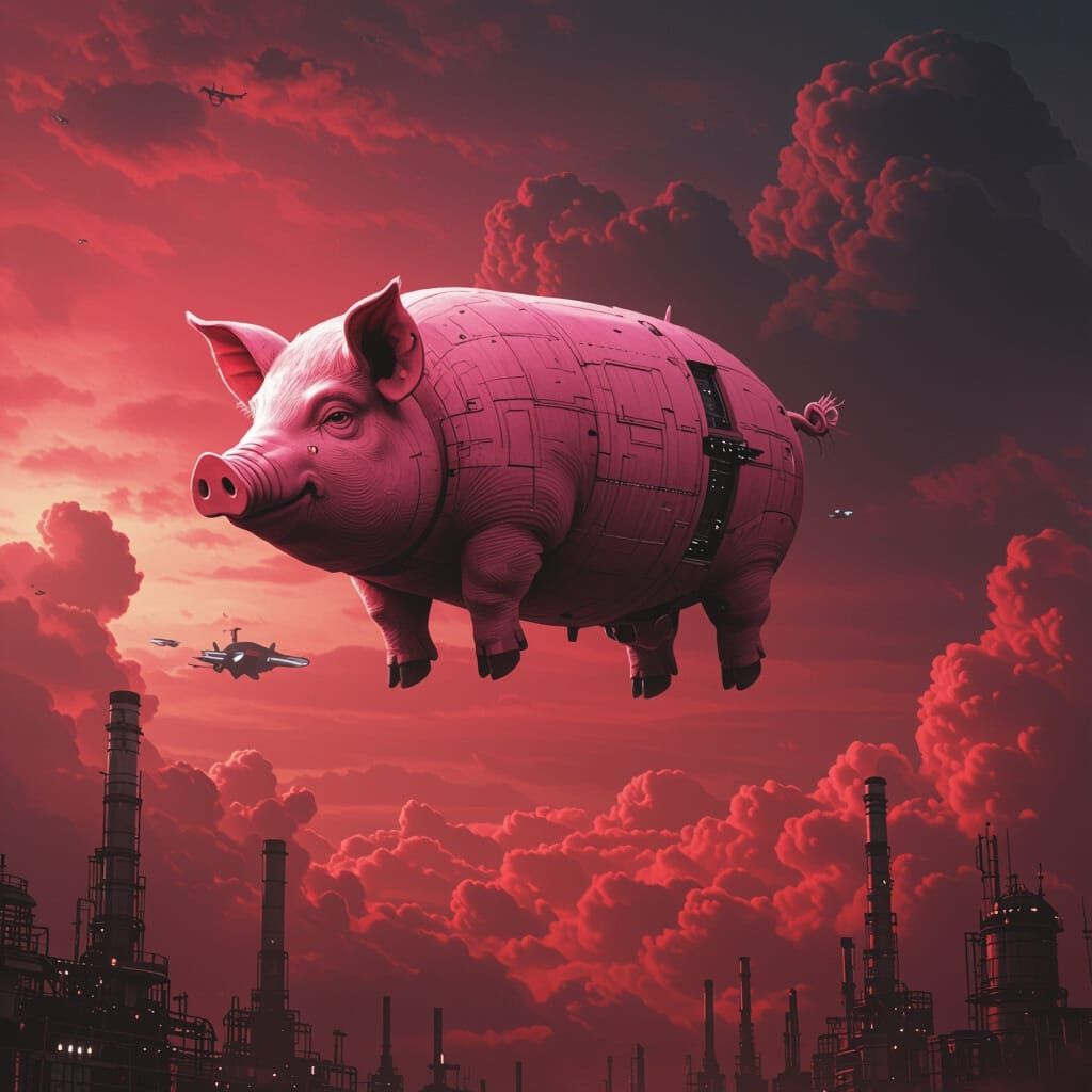 This image shows a massive pig floating amidst dark, ominous clouds in a dystopian, futuristic landscape. It evokes the styles of surrealist and visionary artists, with a sense of industrial decay.