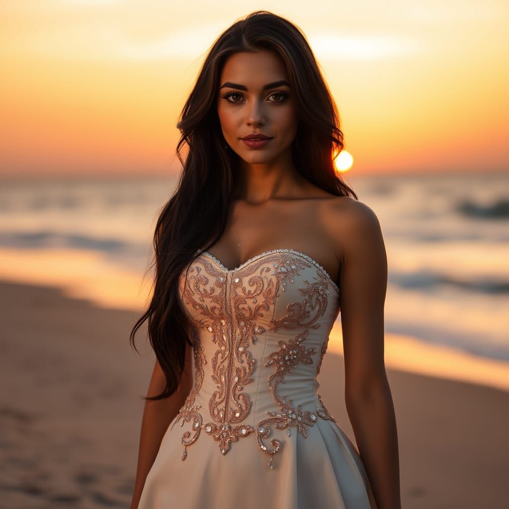 A captivating image of a woman in a vintage wedding dress on a beach at sunset. The golden light enhances the dress's beading. Captured with a shallow depth of field and warm tones.