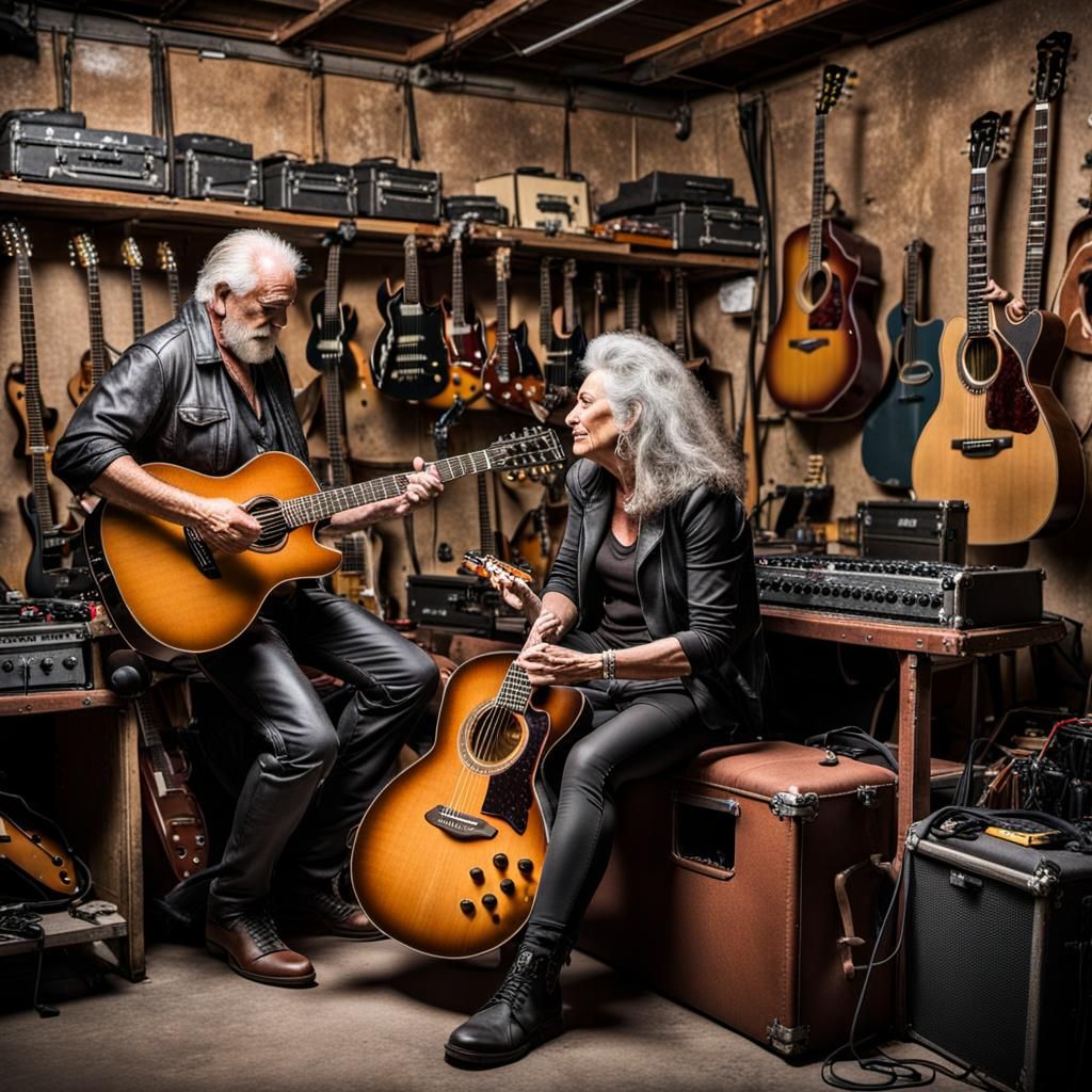 A digital rendering of a guitar player performing in a garage, accompanied by his wife. The image captures a gritty rock and roll aesthetic with detailed textures and dramatic lighting.