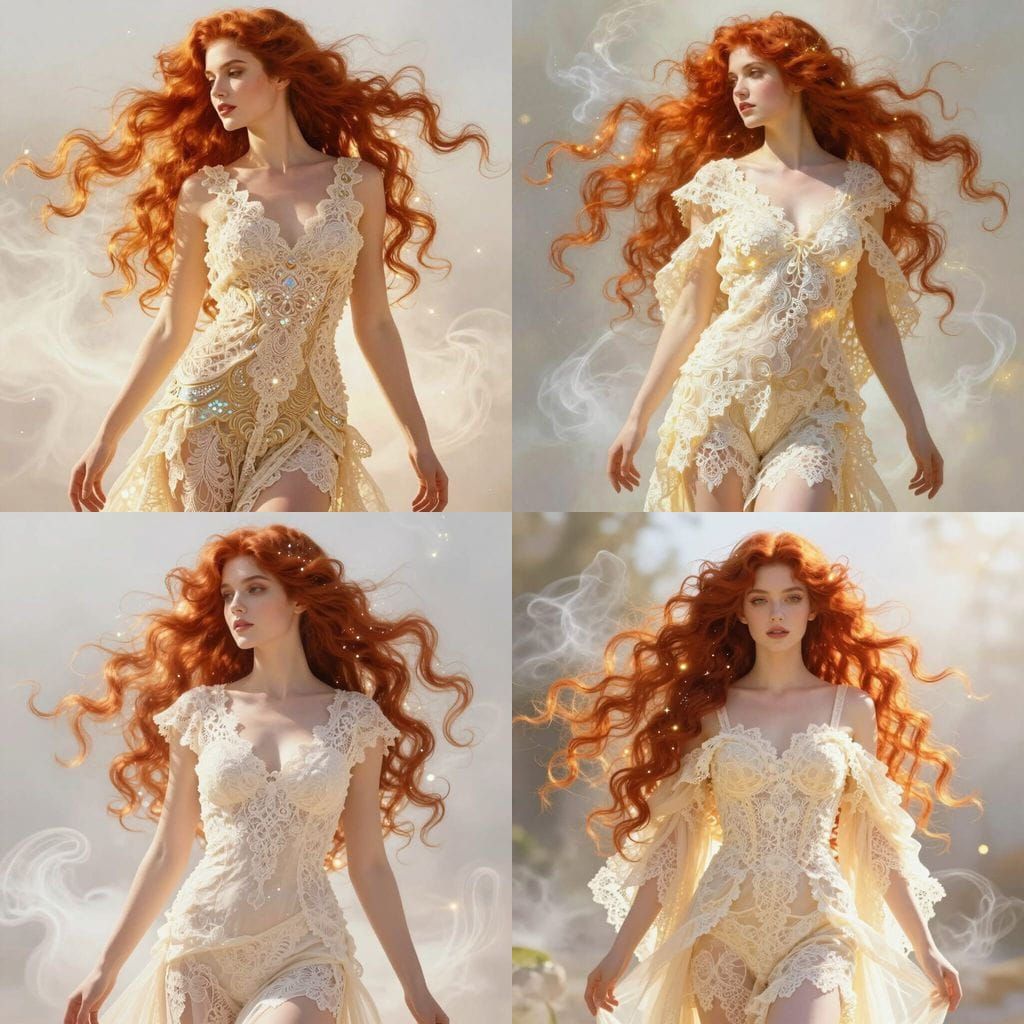 This image features an elegant fantasy woman with luminous skin and a dress adorned with detailed lace. Her cascading red hair and ethereal atmosphere create a magical, sophisticated vibe.